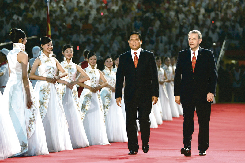 8月8日晚23点25分,北京奥组委主席刘淇、国际奥委会主席罗格从VIP通道走向“奥林匹克讲台”致词