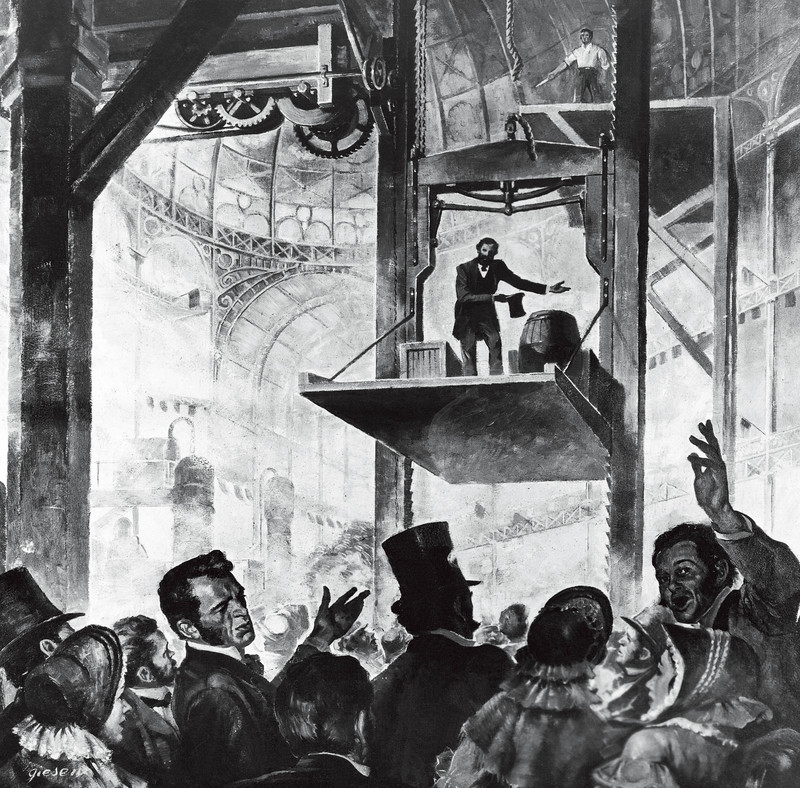 ( 1853年,奥的斯在纽约世博会中演示他的安全升降机 )