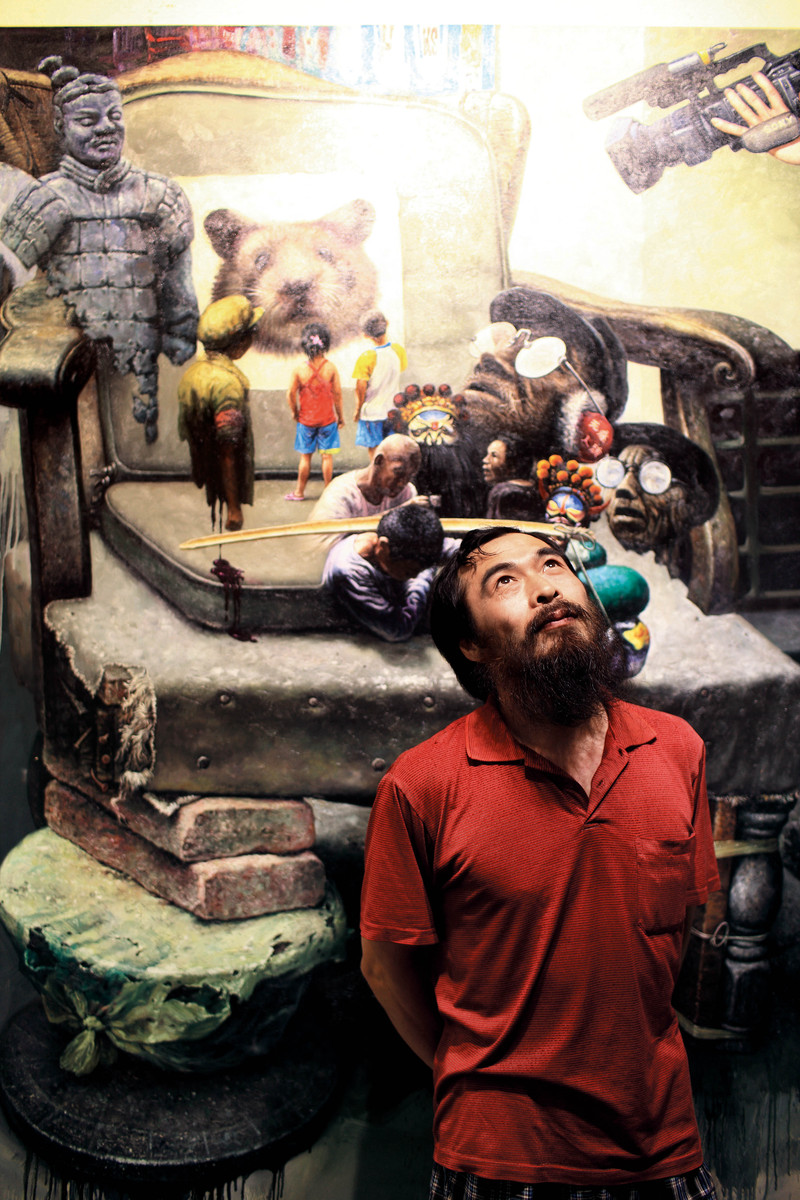 ( “大胡子”尹训志第一次入选大芬村艺术展,他可以把搞创作的梦继续做下去了 )