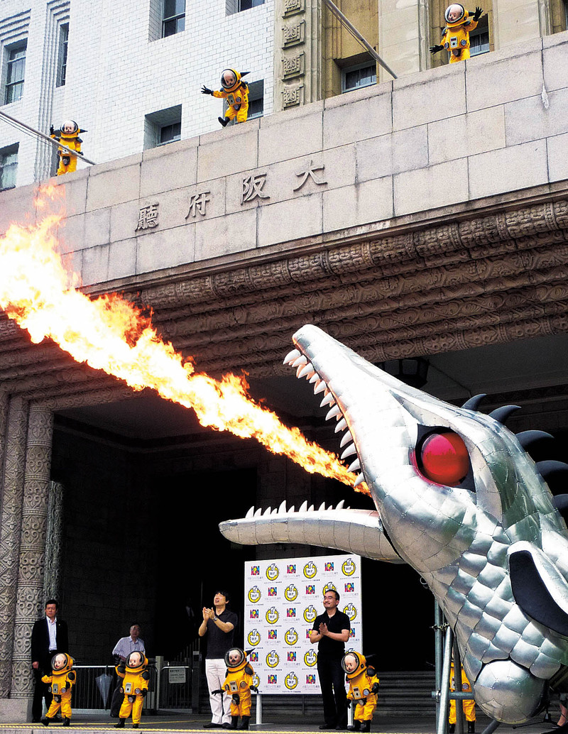 6月7日,大阪市政厅前,矢野宪司设计的艺术品在喷火。大阪举行这场活动是为了征集摆放在市政厅门口的艺术品。 )