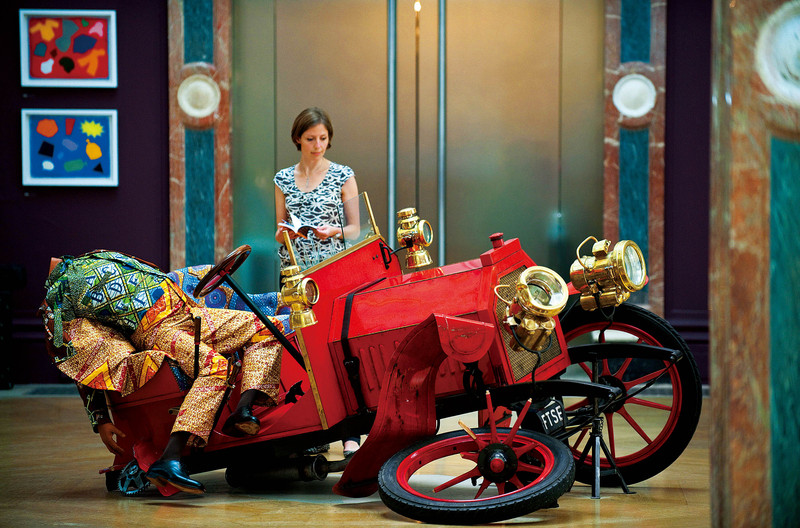 皇家美术学院夏季展的那个 6月9日,很多明星嘉宾前往参观。这一展览是世界上最大的公开征集当代艺术品的展览,从1.1万多件作品中挑选了1267件作品。图为一位女性参观者在观看因卡·修尼巴尔的作品“撞车”。 )
