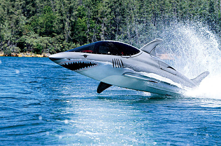 8月11日,美国富翁罗布·伊恩斯制造了一艘“007式”的仿真“鲨鱼潜艇”,不仅可带乘坐者潜入水下,而且可以冲到水上约4米的空中。“鲨鱼潜艇”是按照水下杀手大白鲨的外形设计的,水上最高时速可达80公里,水下最高时速为40公里,内部可乘坐2人,船身长度约5米,造价约为6万英镑。 )