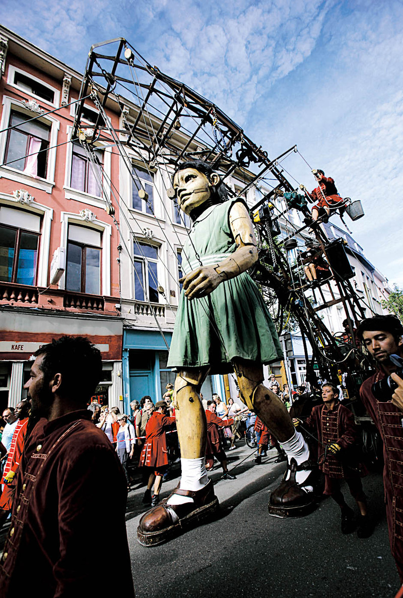 8月20日,巨型人偶在安特卫普的街道上巡游,这是法国街头剧团皇家豪华木偶剧团演出的一部分。 )