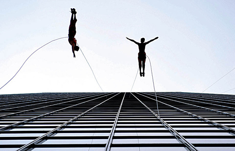 8月17日,美国达拉斯,班德鲁普舞蹈团的空中舞蹈演员们在摩天大厦上表演特技舞蹈。 )
