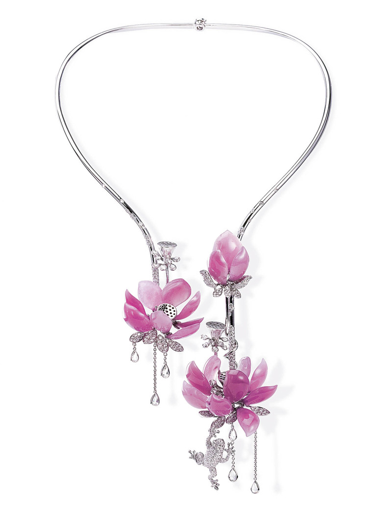 富御(Rich Jade)的2010年艺术珠宝“临水照花”用玉雕技法,把玻璃质感的紫罗兰翡翠转化为荷瓣的三种不同姿态。重叠的荷瓣去除了繁琐的镶嵌,因为刻意降低了座台,每一片荷瓣的立体轮廓被细致灵动地表现出来。■ )