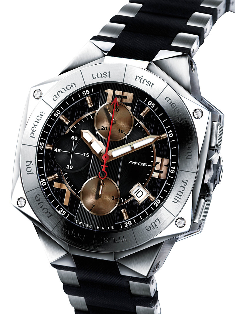 Attos(爱徒)的Onesta运动腕表,表壳造型来源于“大卫之星”,由两个多边形面夹住安装机芯的主要外壳,表盘面也是由十字形构成,底盖上镂空的十字形露出ETA 7750全自动机械机芯。表圈上刻有“爱的属性”,传递出在真实中才有生命,在爱中才有喜乐、平安的信息。■ )