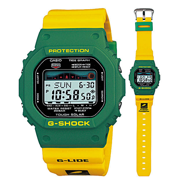 黑与白,黄与绿,卡西欧在G-Shock上充分试验反差色的协调比例。延续G-LIDE表形的塑胶质感,数字显示屏幕可以在4度灰阶和纯黑色之间选择,为了解决塑胶表带长期佩戴的汗渍问题,在表带横向关节之外,还加入了非规则的纵向导汗槽。■ )