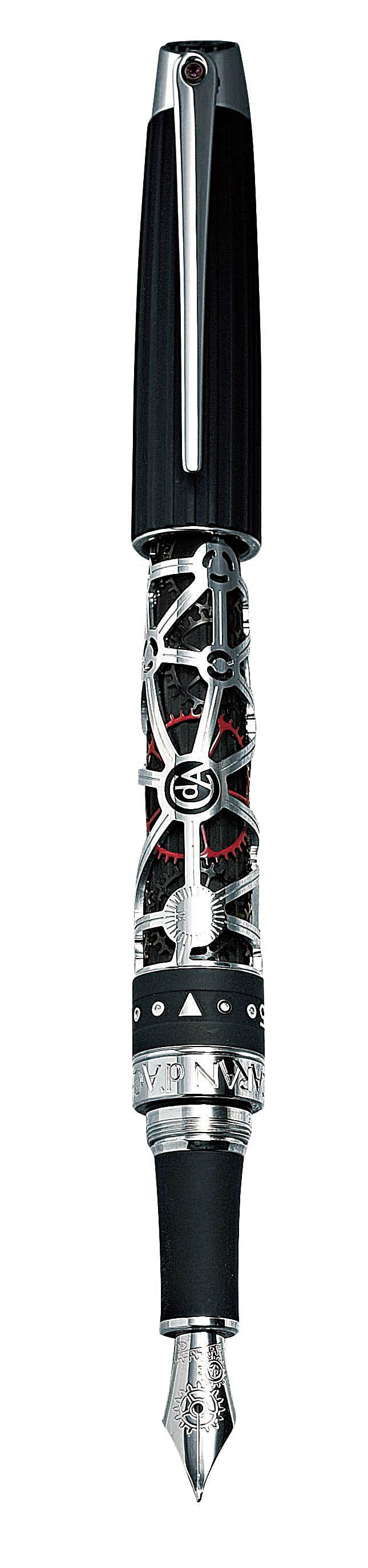 Caran d'Ache以镀银铑为主要材料的1010 Chrono Sport属于百分百向机械腕表设计致敬的钢笔,笔杆最外层雕刻机芯一样的搭桥装饰,内层是一个个齿轮。笔环部分用蓝宝石水晶,上面刻15、30、45等数字装饰。笔盖顶端的弧状模仿腕表的表冠,尖削形的笔夹当然是指针的形状。■ )