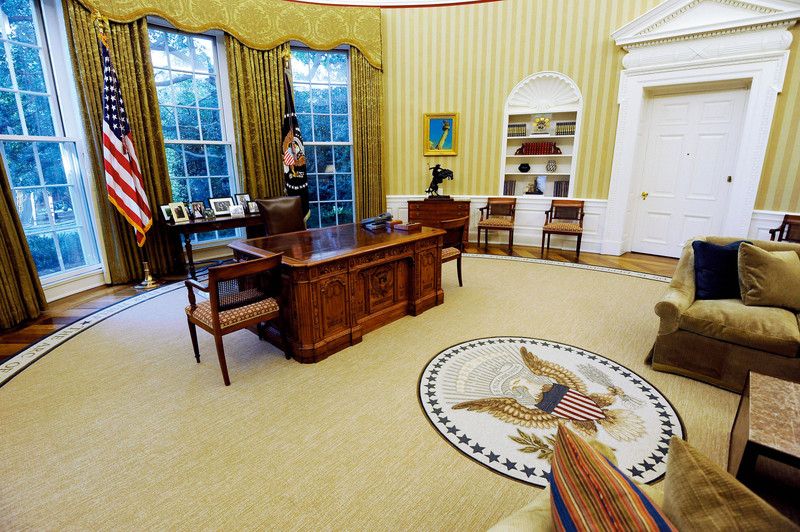 在奥巴马总统夫妇带着孩子前往马萨葡萄园岛度假期间,白宫的工作人员给椭圆形办公室贴了新墙纸,换了新地毯、新沙发和咖啡桌。新地毯由小麦色、奶酪色和深蓝色三种颜色构成,上面绣有名言,包括罗斯福的“我们唯一需要恐惧的是恐惧本身”、 马丁·路德·金的“道德世界的弧线很长,但它总是弯向正义”。