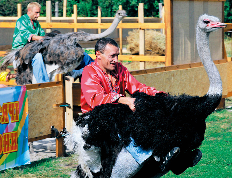 9月4日,乌克兰基辅附近一家农场举行了骑鸵鸟大赛,这是乌克兰首届鸵鸟节的活动。在乌克兰,养鸵鸟十分流行,也有很多这样的农场。 )