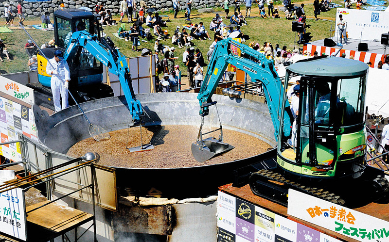 9月5日,日本北部山形县,挖掘机在直径6米的锅子里搅拌芋头。这是日本传统的芋头节,为游客准备了3万份美味的芋头以供食用。 )