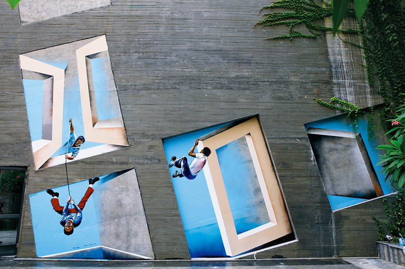 Run是意大利人,2007年移居伦敦。总策展人、深圳市规划和国土资源委员会深圳馆策划建设办公室主任周红枚介绍,Run这位艺术家把极具个性色彩的街头艺术带入了伦敦一些废弃的建筑群中,作品多是巨幅的用滚筒绘制的面孔和人物形象。在大芬,分配给他作画的墙体位于天桥进入屋顶庭院的通道一侧,道窄,但墙体高大,为画面如何形成观看视角带来了挑战。Run画了《头顶上的蓝天》,画面中央是一个身形巨大却有着婴儿般面容的白色的半人半兽,背负一小块斑斓城市,俯身长龙,画面最下方有几个灰色的舞蹈者正努力做出奔跑的姿态,呼应了他的名字。