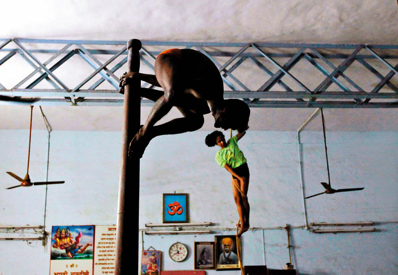 一名男子正在练习印度传统运动——钢管舞。这项运动起源于12世纪的孟买。据教练称,这批练习者将在新德里的英联邦运动会上表演。 )