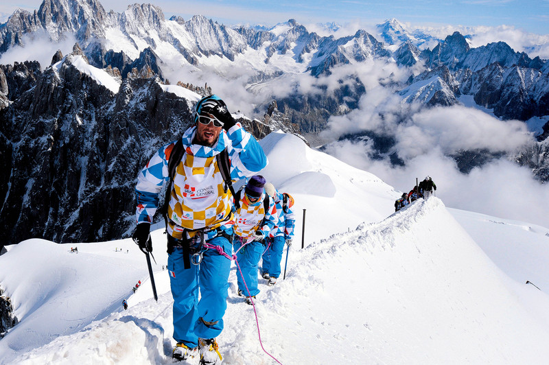 法国滑雪队运动员登上南针峰,为安纳西申办2018年冬季奥运会造势。最终结果将于2011年7月宣布。 )