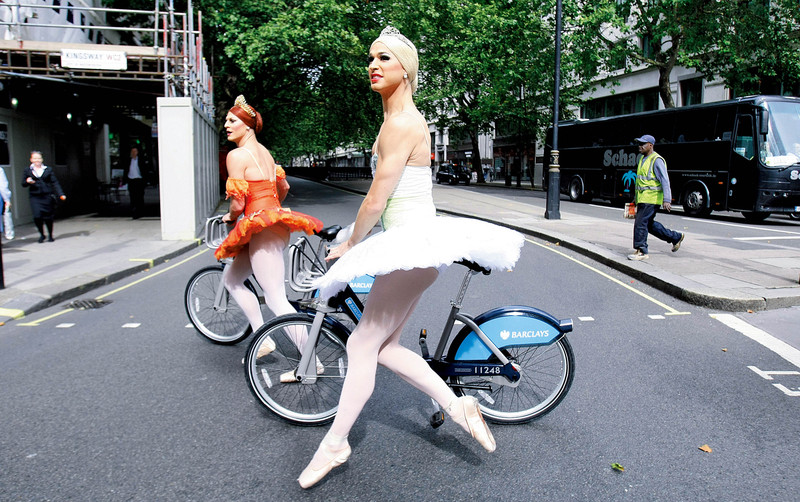 9月13日,纽约全男芭蕾舞团的两名芭蕾舞演员骑着自行车在伦敦的街头宣传,他们即将在伦敦举行14场表演。 )