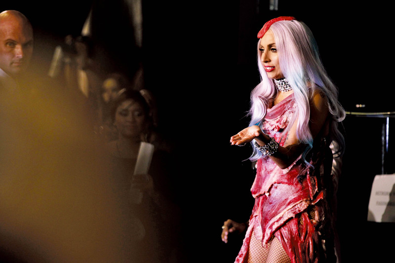 Lady GaGa在9月12日的美国MTV音乐录像带大奖颁奖典礼上获得“年度最佳音乐录像带”等8项大奖。在上台领取其中一个奖项时她身穿一套“鲜肉”礼服。周一她在脱口秀节目上说“鲜肉装”是为表明自己不是“任人宰割”:“如果我们不挺身守护我们的信仰,如果我们不争取我们的权利,不久我们的权益就像骨头上的肉一样任人宰割了。” )