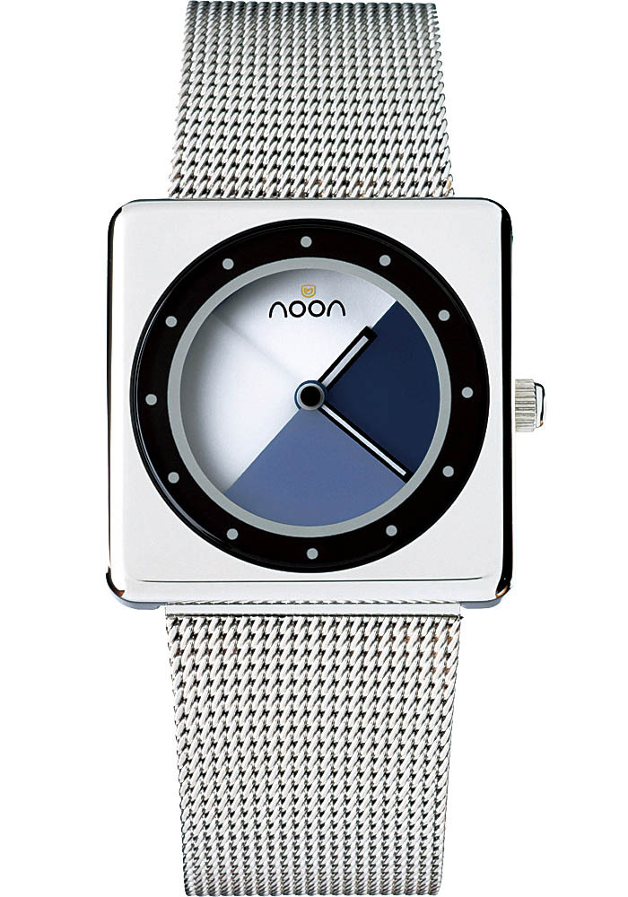 时针和分针的交错,以指针作为分水岭,使用透明和半透明的色彩组合,在表盘内混合出4个颜色区域,借以表达白昼和黑夜。丹麦Noon腕表试图以色差来强化时间的色彩意味。圆形和正方形的不锈钢表壳,一律以黑色圆环作为表盘边缘,以突显12小时制的交错流转。■ )