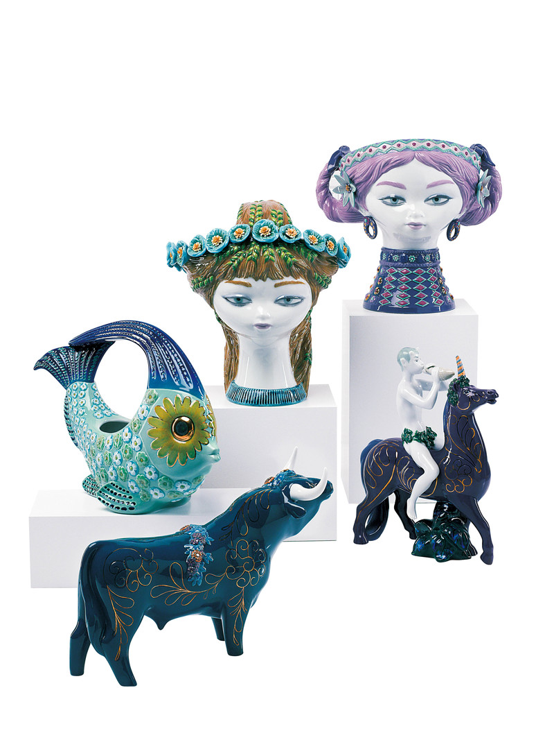 通过保留原有的色泽并使用金属绘色的方法,Lladró重新装饰推出一系列上个世纪70年代的作品,包括拜占庭少女像、带花环的公牛、牧神与独角兽等等。公牛的处理有几分抽象艺术的意味,而拜占庭少女像的颈部装饰和耳环是拜占庭时代灿烂明快的典型风格。■ )