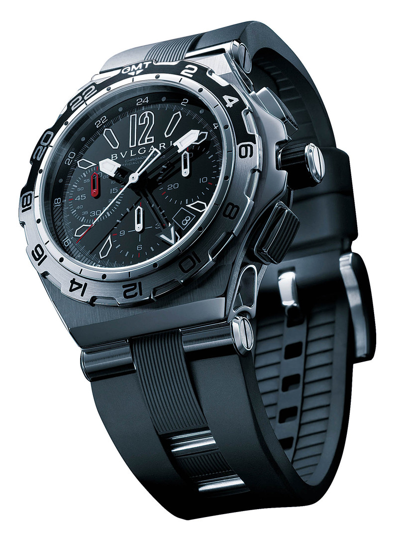 具有三时区独立计时复杂功能的宝格丽Diagono X-Pro运动腕表,黑色蓝宝石表盘由三重叠结构加图案构成,时刻的白色夜光涂层与其他指针顶端的色彩形成对比。表盘的外圈有24小时刻度,分为两个不同的12小时显示区间,在GMT指针扫过的轨迹上清晰地显示出日、夜区域,第三时区由另外可双向旋转的带刻度表圈控制。日夜的显示以不同颜色的材质出现在两个区间上,日间半圈是精钢材质,夜间半圈是橡胶的材质。■ )