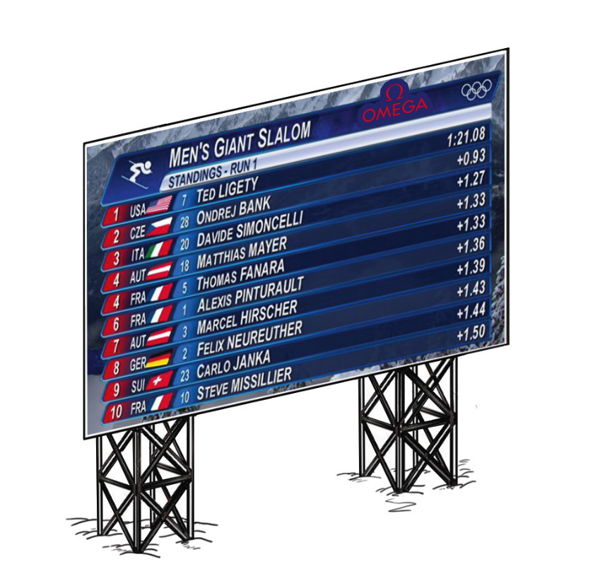 欧米茄的高清记分板不仅能显示文字和实时信息,还能播放动画、运动员照片和视觉图像。借助现代特效,冠军姓名、比赛结果和所属国家的国旗都会醒目呈现,令每场比赛都更加激动人心。