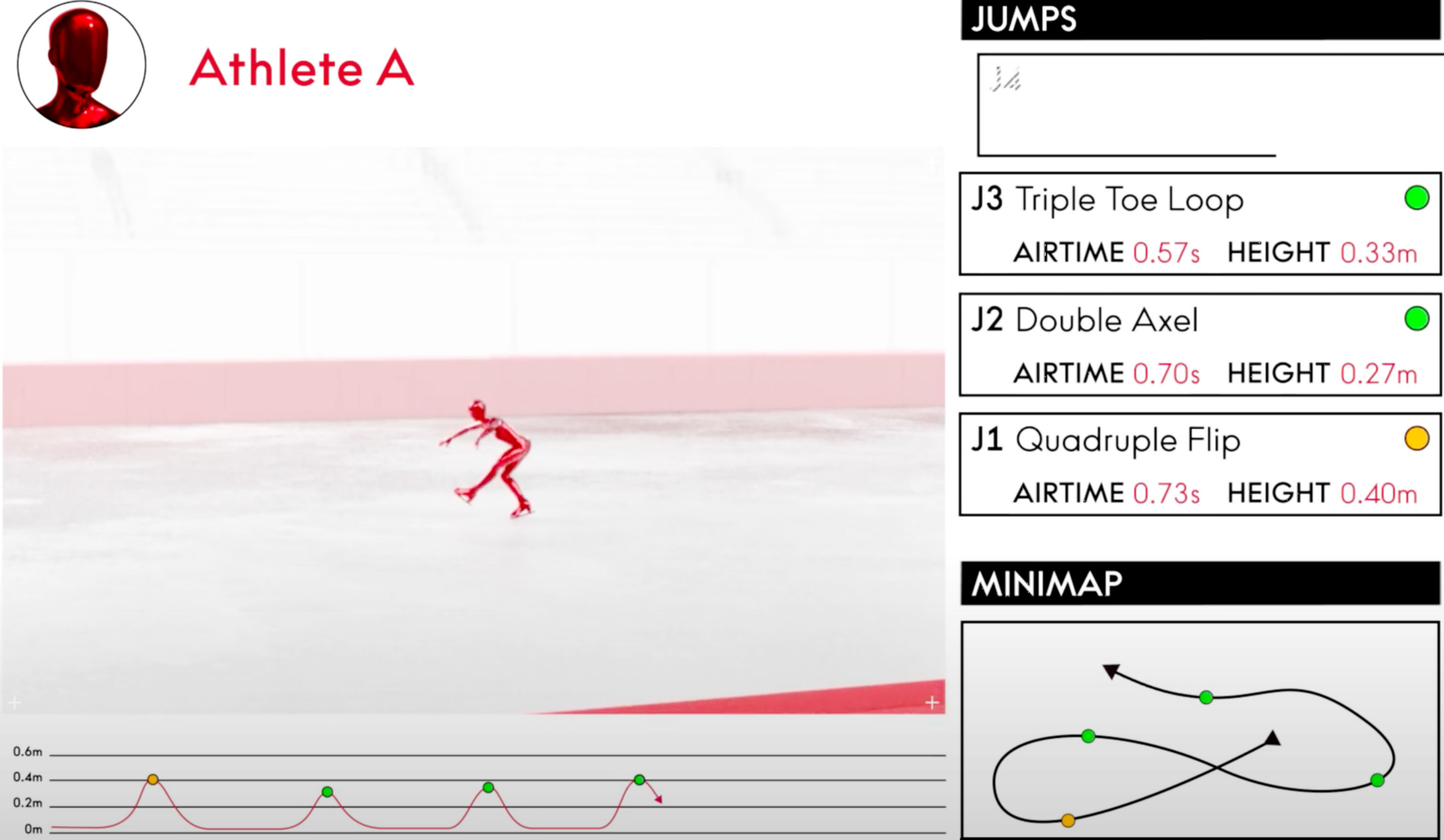 除了对冰刀的识别,欧米茄计算机视觉技术在花样滑冰项目中将展现前所未有的全新功能。例如,该技术如今在双人项目中可分别追踪不同的选手,立即检测他们的动作与跳跃类型,并在屏幕上同步显示。这不仅有助于裁判打分,也提升了观众的观赛体验。运动分析还包括实时的跳跃高度、滞空时间与落地速度,所有这些数据将与图形跟踪相结合,以便更深入地了解运动员的动作表现。