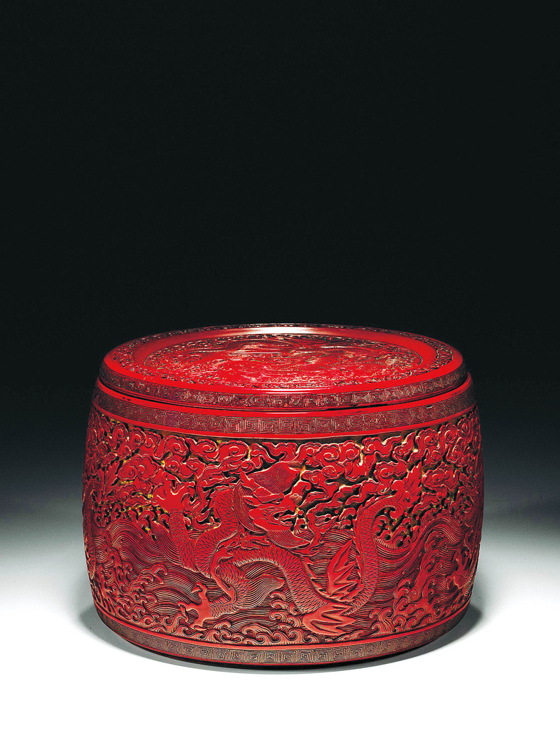 ( 明宣德剔红镌刻填金“大明宣德年制”六字横款虫罐 )