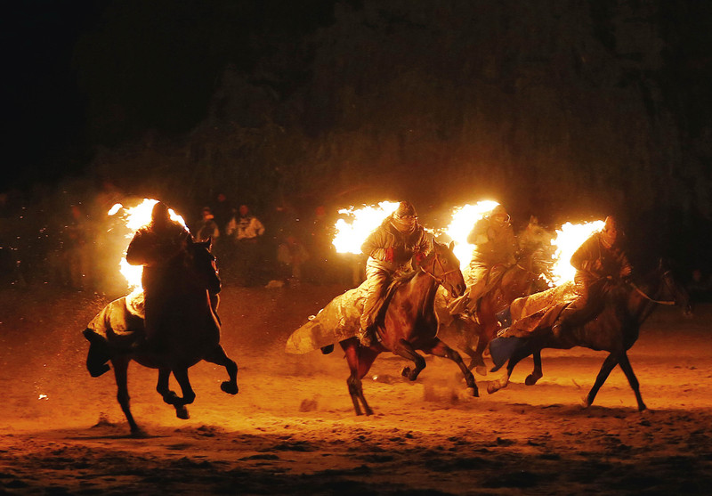 (左页上图) 在9月3日至8日,吉尔吉斯斯坦在其著名旅游胜地伊塞克湖畔举行第二届世界游牧民族运动会。本次运动会有40多个国家的代表团参加,竞技项目增加至23个。值得一提的是,中国内蒙古此次也派出代表团参加摔跤与赛马等八个项目的角逐。图为9月3日运动会开幕式上的马术表演。
