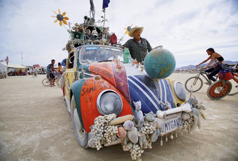 (左图) 在美国内华达州的黑石沙漠,每年的8月底9月初都会举行一年一度的“火人节”,来自世界各地的人涌入这里参加狂欢活动。为了庆祝今年的“火人节”,主办方在广袤的沙漠中建立起一座巨大的临时城市,这里拥有房车、帐篷等完善的基本生活设施,可以容纳约7万人在此地聚集狂欢。图为来这里参加火人节的民众。