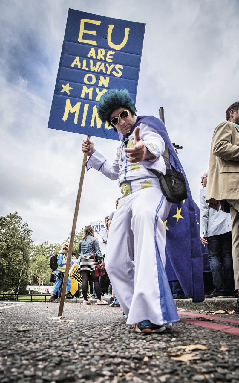 (右图) 9月3日,亲欧盟示威者在伦敦举行游行,抗议今年早些时候进行的退欧公投,呼吁英国政府与欧盟加强联系。