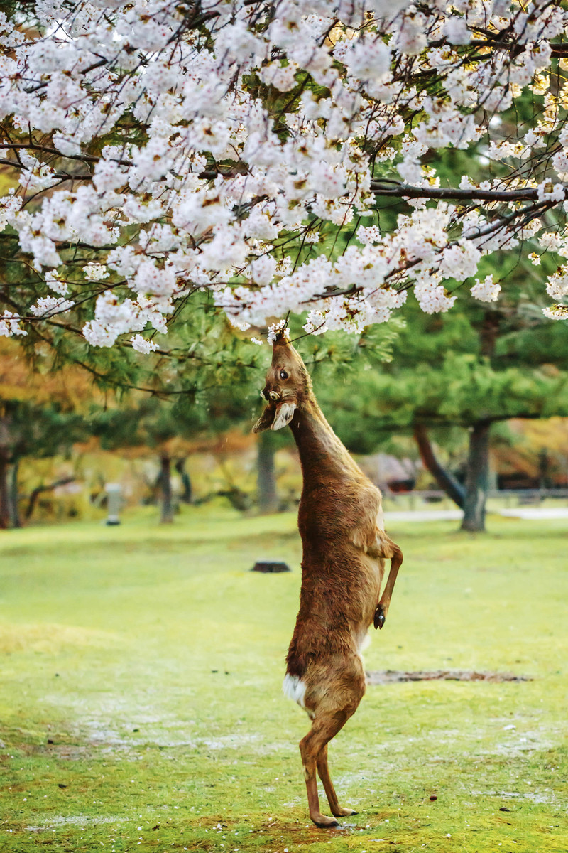 日本 | 小鹿赏樱 日本奈良,一头雄性梅花鹿直起身子,仅用后腿站立去够树上的樱花,看起来像在闻花香。