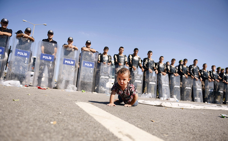 土耳其 | 小难民 9月15日,土耳其毗邻希腊和保加利亚边境的埃迪尔内市,在连接土耳其与欧洲的高速公路上,一位小难民在土耳其警察和宪兵面前爬行。土耳其安全部队阻止难民前往埃迪尔内市中心。