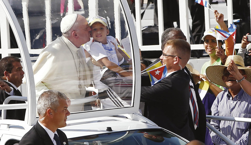 古巴 | 教皇到访 9月21日,教皇访问古巴奥尔金省时亲吻一名男孩。9月19日,罗马天主教教皇方济各抵达了古巴首都哈瓦那,开始为期4天的访问。他受到古巴领导人劳尔·卡斯特罗的迎接。
