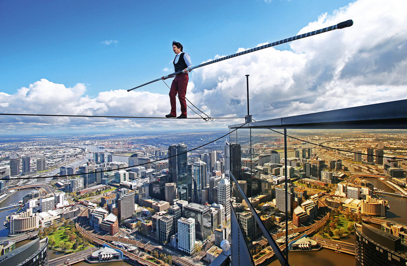 澳大利亚 | 云中行走 9月16日,36岁的澳大利亚走钢索表演者凯恩·皮特森走过了架在墨尔本尤里卡观景塔之间距离地面300米、长21米的钢索,这是南半球有史以来最高的走钢索表演。皮特森此举是为了纪念电影《云中行走》抵达澳大利亚影院。皮特森模仿的是电影的主角、法国杂技艺术家菲利普·帕特1974年在世贸中心双塔之间走钢丝的壮举。