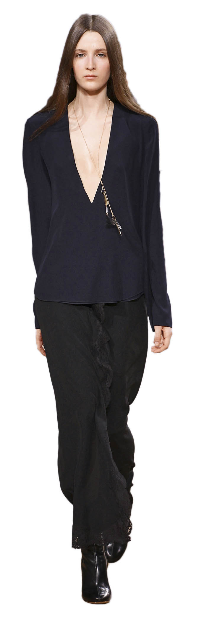 CHLOE2015秋冬季女装 以欢快清新的田园风情为灵感基调,柔和的淡色色彩盘中注入了男装色彩元素,包括散发女性意味的紫罗兰、米黄、矢车菊蓝与深色海军蓝、石南绿、朱红、象牙白以及棕红色无间交织。立体触感的面料贯穿始终,从柔软的格纹绒呢、挺阔的麦尔登呢、复古灯芯绒到浓密羊毛、精致暗色蟒蛇皮。