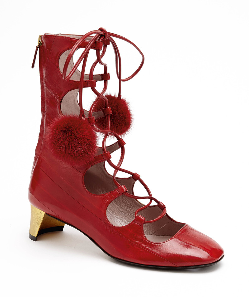 Gucci Heloise系列女鞋 标志性4.5厘米金色半月形鞋跟,方形鞋头。鞋子上的毛球材料为水貂毛,短靴为罗马角斗士风格,十字形多层绑带,绑带顶端以水貂毛球收尾。鞋子后跟有拉链方便穿脱。