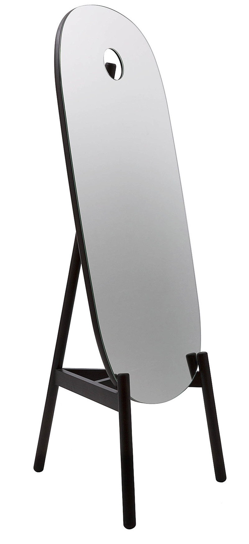 立式镜子 Cappellini品牌的PEG落地镜以白蜡木为镜框,透过椭圆形镜子上端的圆洞,可以看到支撑镜子的三角架。这个镜中圆孔一方面为了呼应同一系列中的桌子,也显示出设计师Nendo对细节的注重。