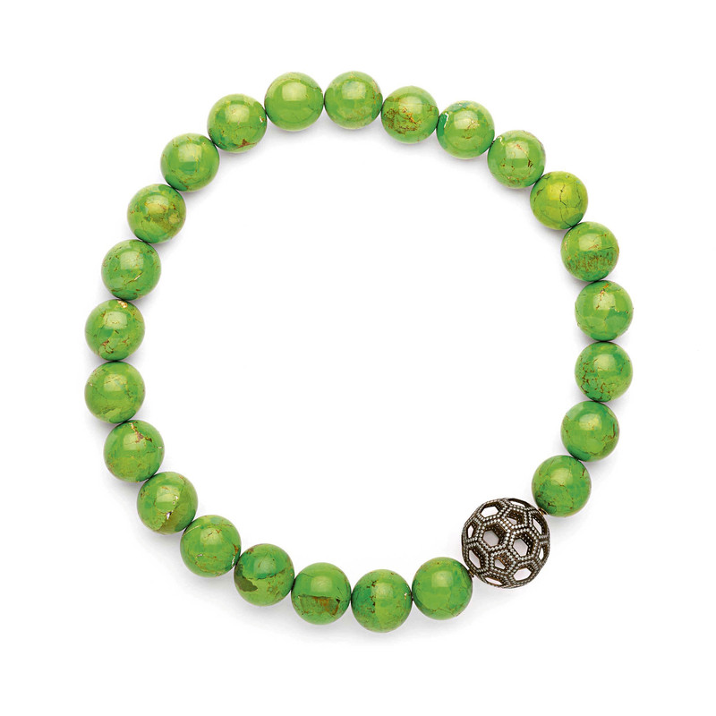绿松石项链 瑞士珠宝设计师苏珊·泽兹以对色彩及生活的热爱著称,她设计的这款That's Amore项链由24颗绿松石圆珠和一颗镶有超过700颗钻石的钛质多面圆球组成。绿松石这一铜铝磷酸盐矿物因为富含铁质,呈现出鲜明诱人的绿色调。