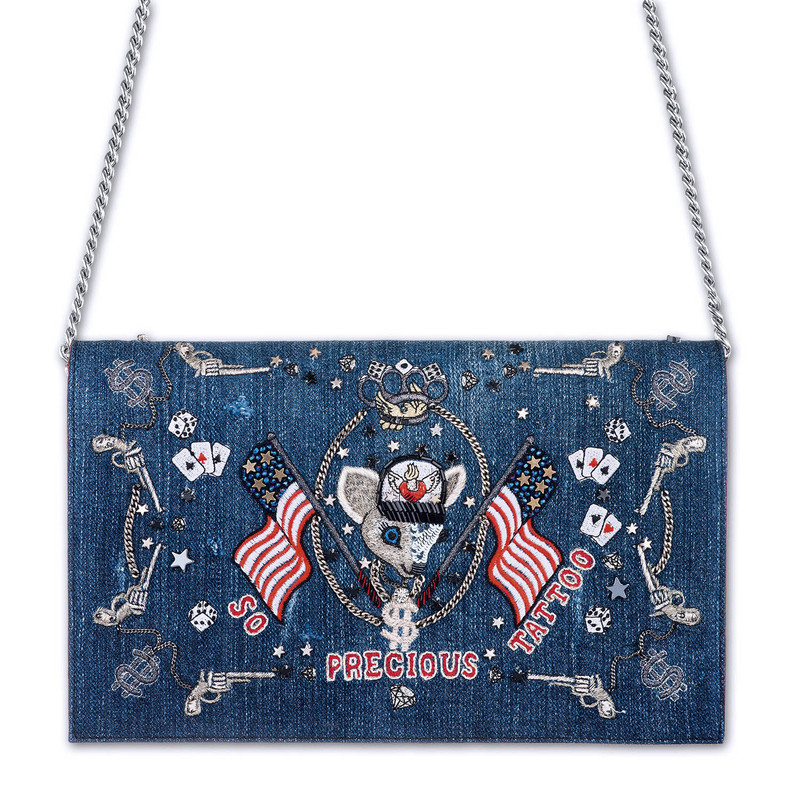 刺绣手袋 以世界旅行作为主题,室内设计师卡罗·泰西娅推出“珍贵”系列手工刺绣牛仔布手袋。整个系列总共38款不同刺绣图案,引用当代艺术家的作品或者向卡通人物致敬,融合了艺术气息与古怪的幽默感。
