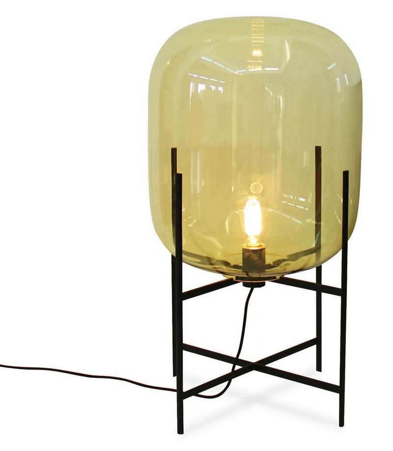 玻璃气球 Pulpo品牌的Oda落地灯,黑色金属结构托起手工吹制的琥珀色有色玻璃灯罩。