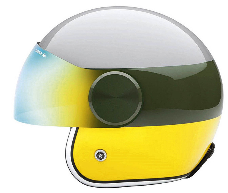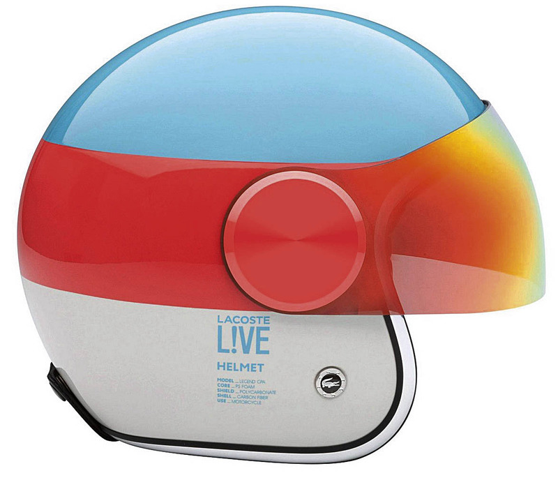 彩色头盔 Lacoste L!VE的彩色头盔系列,赋予摩托车头盔新鲜的时尚感觉,色彩搭配令人耳目一新。除了色彩之外,头盔上还有一些精致的细节,如小鳄鱼和星星图案的浮雕纽扣。
