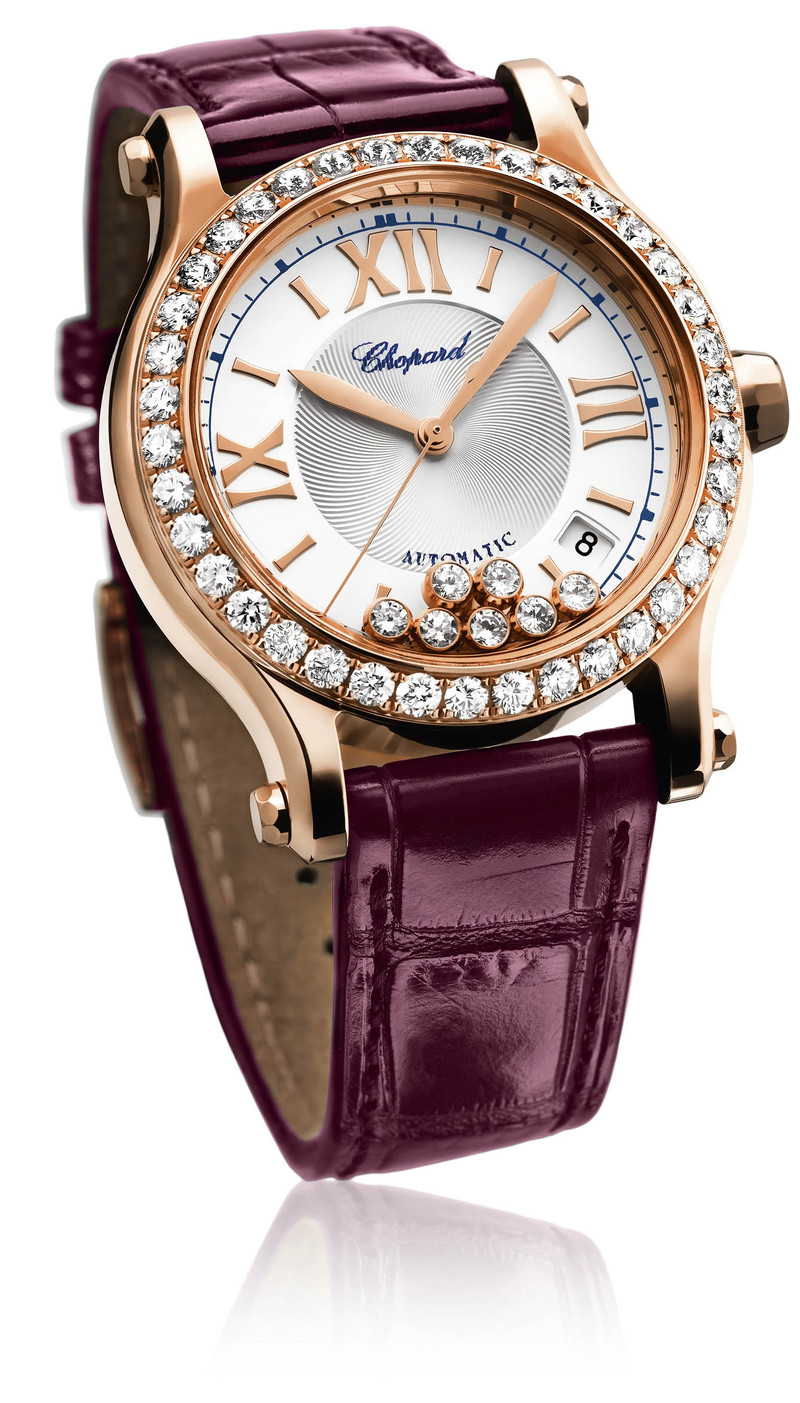 萧邦Happy Sport Medium Automatic腕表 18K玫瑰金表壳,动力储存42小时,扭锁状的银色表盘致礼经典制表装饰传统并与表盘上的7颗可移动钻石相得益彰。背面的蓝宝石水晶配以C?tes de Genève花纹,可供窥探自动发条机芯的运动。
