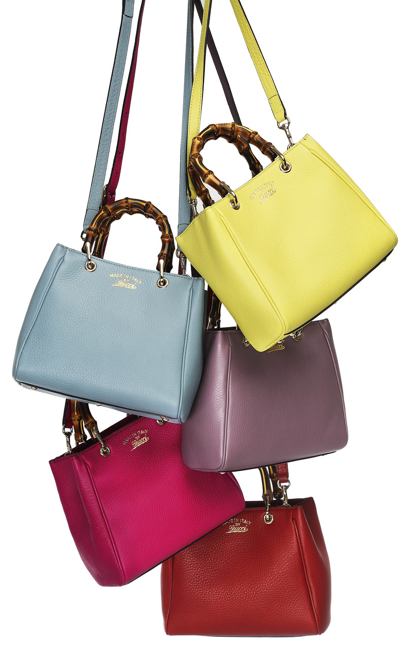 Gucci2015春夏系列迷你竹节包 精致的竹节手柄由意大利纯手工创作,展现品牌精湛技艺。在颜色上,迷你Bamboo Shopper提供了天空蓝、柠檬黄、桃红、薰衣草紫等多种选择。包身简洁轻便,搭配可拆卸与调节肩带。