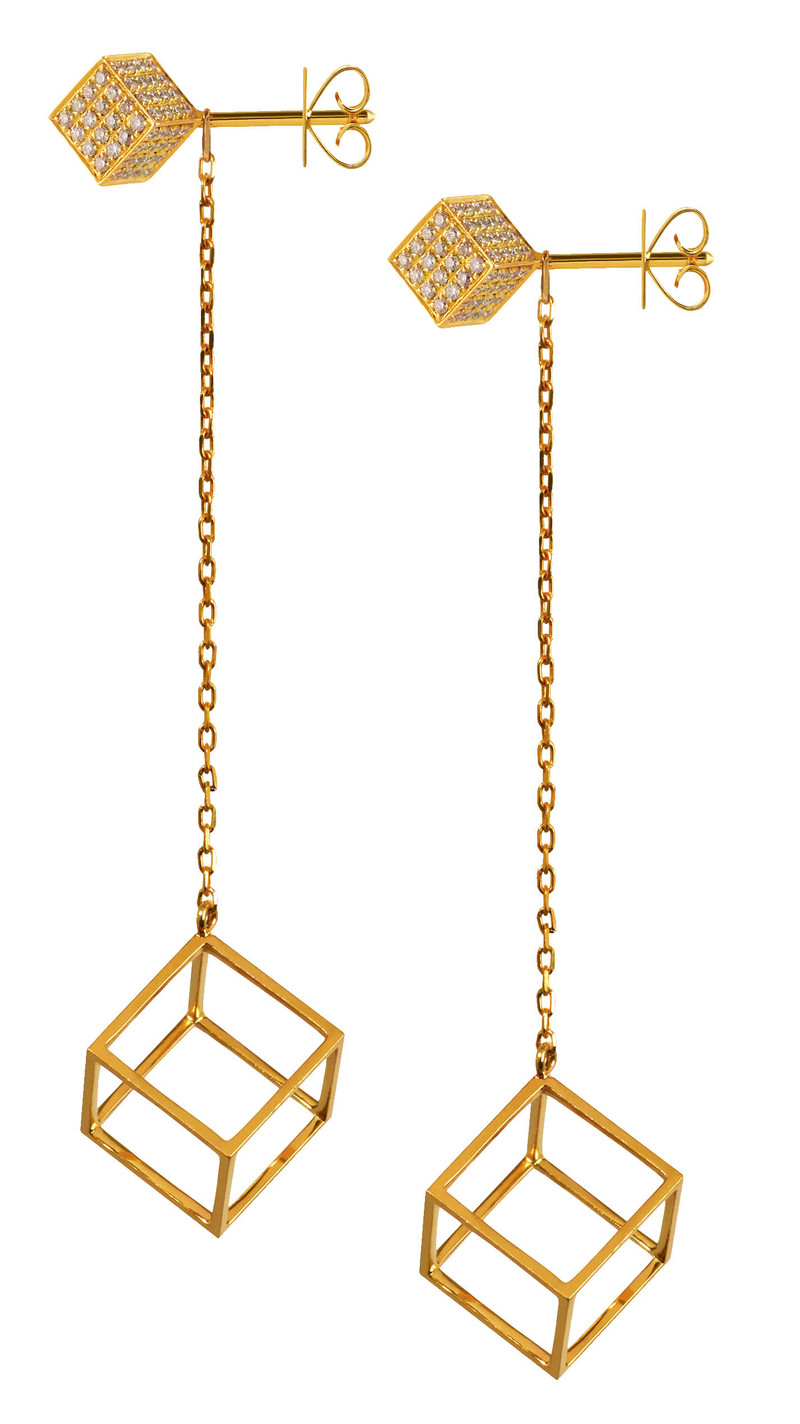 空心立方体 Noor Fares的珠宝设计以优雅流畅的线条为特征,比大多数珠宝显得更加轻盈细腻。这款立方体耳环突出了空心几何形的造型,与耳钉上的实心镶钻立方体形成呼应。