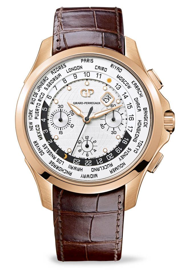 世界旅行 GP芝柏表旅行家系列世界时腕表,直径44毫米玫瑰金表壳内,叶形指针与圆点时标覆有夜光涂料,乳白色表盘中央的纹理象征地球经度及纬度。表盘边缘有24个时区代表城市名称斜面圈环,里面是一圈24小时日夜圈环,全球24个时区时间一目了然