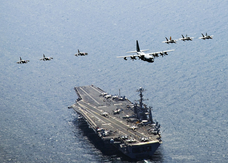 2010年7月,美军“华盛顿号”航母搭载多架运输机、战斗机参加美韩黄海军演