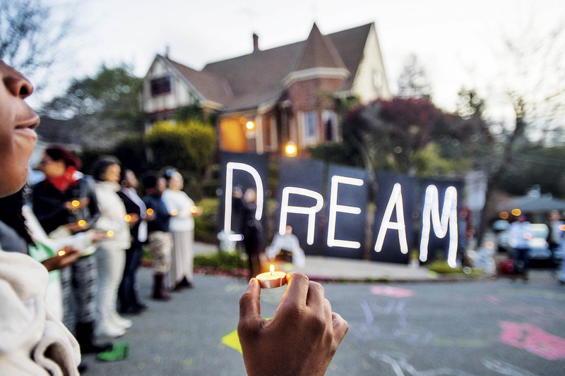 美国 | 梦想1月19日,美国加州奥克兰市,在市长住所前,抗议者聚集在“梦想”的发光文字下,要求市长开除有使用暴力记录的警官。他们还把马丁·路德·金的照片投射到了市长家的车库上。