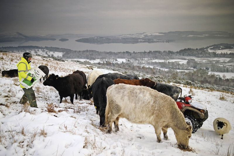英国 | 降温1月21日,苏格兰一位牧民在给加洛维短角牛喂食。近日苏格兰的气温降到零下12摄氏度,气象部门连续第13天发布恶劣天气警报。