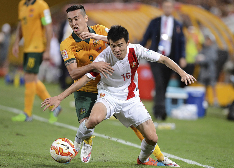 1月22日,中国队在布里斯班与澳大利亚队进行亚洲杯四分之一决赛中,球员孙可拼抢带球