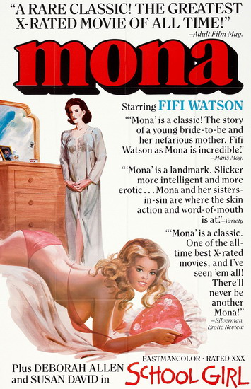 与《色情电影》相比,《蒙娜》最大的特色就是情节相对丰富。同时,《蒙娜》为其后的色情电影奠定了基础并提供了模式,大名鼎鼎的《深喉》(1972)就在《蒙娜》这部片子中汲取了很多养分。