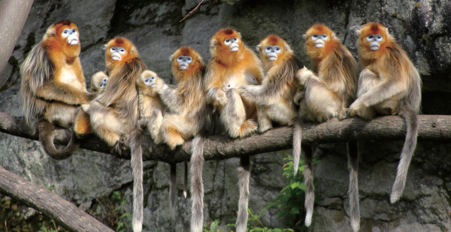 有一年10月中旬的一天,我们在巡山时看到了一群金丝猴,难以数清有多少只。这群家伙并未发现我们,就在我们头顶和周围的树冠上啃树枝,吃树叶和树枝上的地衣类。我的头顶左上侧的川杨树上,并排坐着三只猴子,尾巴垂直而下,沐浴在晨光中,我一览无余地欣赏到了它们金灿灿飘拂的毛发,心中惊叹道它们不愧是森林精灵。